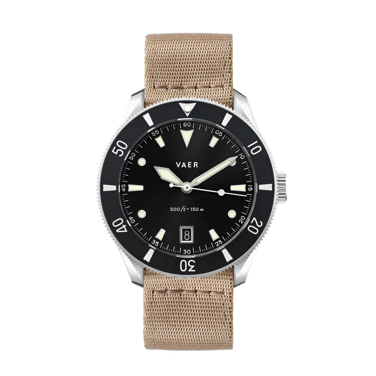 The DS2 Meridian Quartz features Vaer’s signature trapezoidal markers, complemented by C3 Super-LumiNova for exceptional nighttime visibility.Â