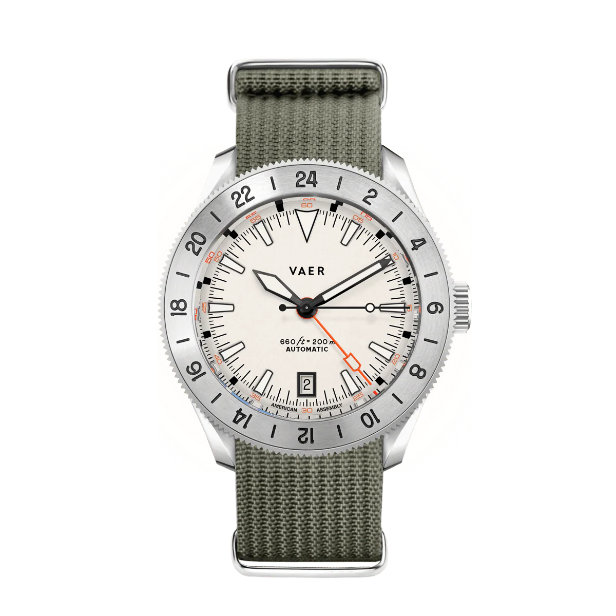 SUMMARY The G5 Pacific is a 1950s-inspired 20ATM automatic watch that stands out in the Vaer line-up as our most premium USA-assembled model and our second automatic GMT. As a G-series model, this watch is part of our dual timezone automatic series, distinguished by its ocean-ready functionality, self-winding movement, and full American assembly.